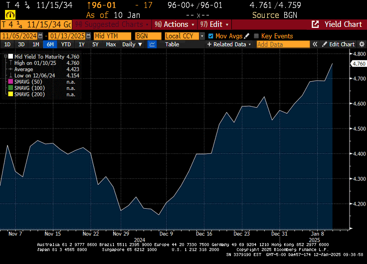 US equity markets fell in the first full week of 2025 as investors recalibrated their Federal Reserve monetary policy expectations. Stronger labor data, a robust ISM Services print, and a weaker Consumer Sentiment report showing increased inflation expectations fueled losses across the US yield curve, where the 30-year yield eclipsed 5%.  Swaps markets now have only one twenty-five basis point cut priced in for 2025.  Trump’s suggestion that he would utilize an Economic Emergency declaration to impose tariffs stoked the inflation narrative.  Trump also suggested strong sanction enforcement on Russian oil and those entities that ship the crude oil, which sent oil prices higher by 3%. The Fed’s December meeting minutes reinforced the idea that the Fed was in wait-and-see mode, with the next cut now expected to come in the second half of the year.  The yield on the US 10-year has increased by over 100 basis points since the Federal Reserve started cutting rates in September, which is unusual in a rate-cutting cycle and has brought in concerns about where equity markets are headed.